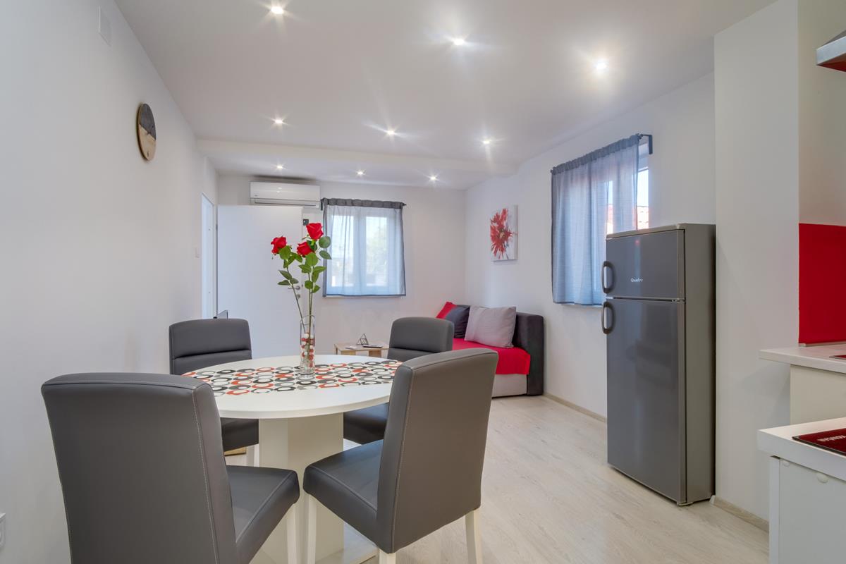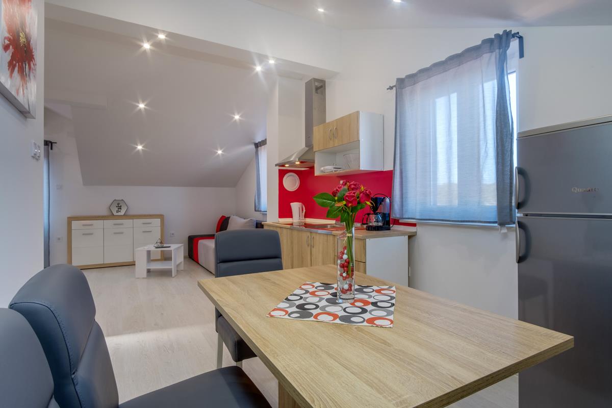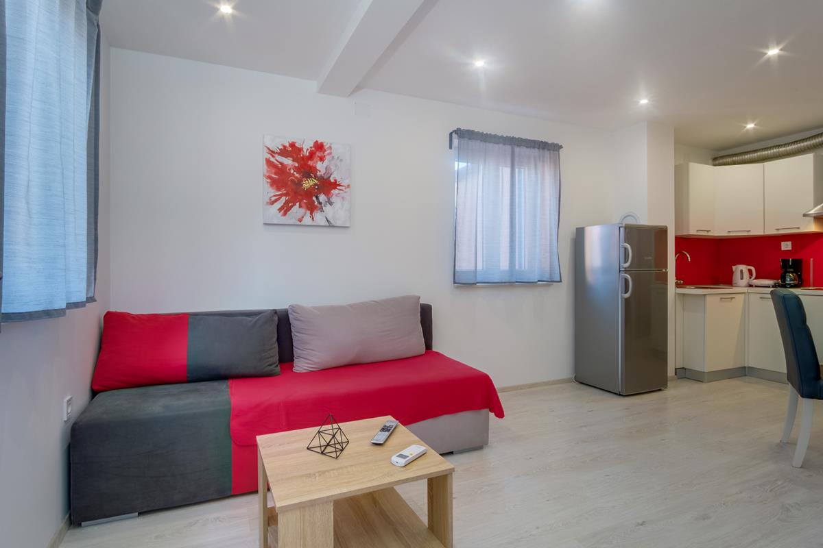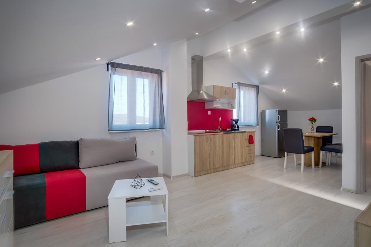 3*** (4+1,4+2) consists of two bedrooms, one with a double bed, the other with two single beds, kitchen, dining room, living room with sofa bed and terrace (dining table, covered with pergola and grill).